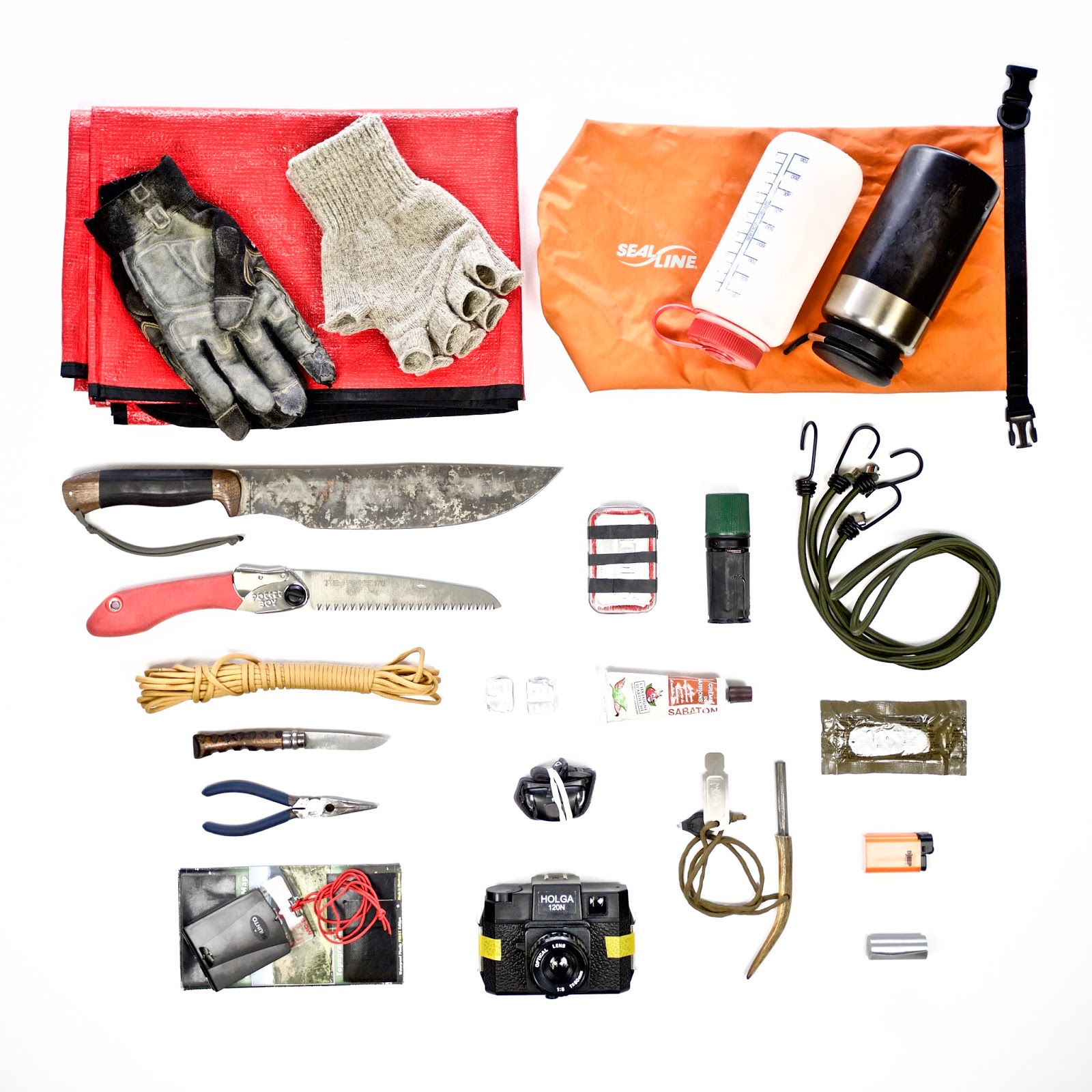 Mais par contre pourrais tu juste définir se qu'il y a en blanc à la droite de la paracorde jaune, ainsi que le paquet marron (peut être un pansement compressif) sous les tendeurs ?