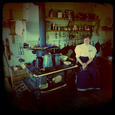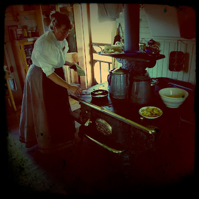 Au fond, dans la cuisine, pièce maîtresse de l'échiquier, un poêle généreux s'offre a la lourde responsabilité de faire vivre la maison. Il chauffe, réchauffe, fait bouillir et malaxe les végétaux. L'organisation est simpliste, mais efficace. Les poêles en fonte attendent leurs tours de garde…et les bocaux, soigneusement posés sur une étagère de cèdre, semblent timidement défier la faim.