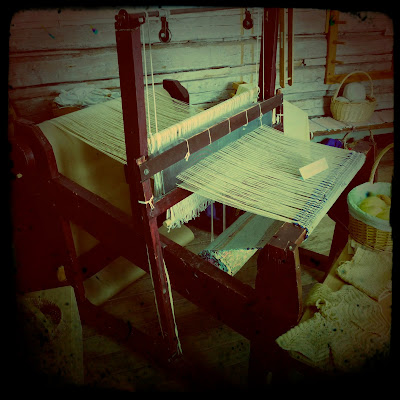Dans la pièce de travail, calque architecte de la cuisine en dessous, un métier a tisser transforme la laine. L'alchimie modeste. Productions simples et utilitaires.